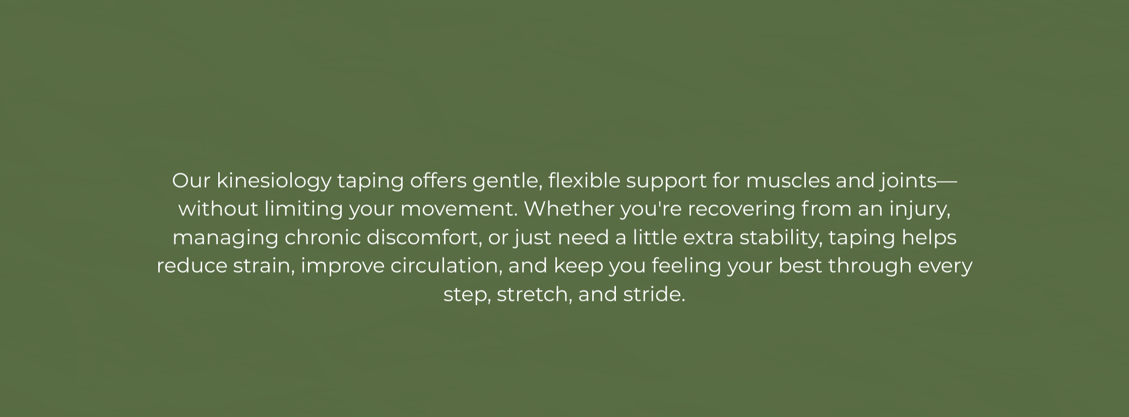 Kinesiology taping works especially well when paired with chiropractic adjustments, soft tissue therapy, or rehab exercises. It reinforces the work done during your session and helps maintain results between visits.